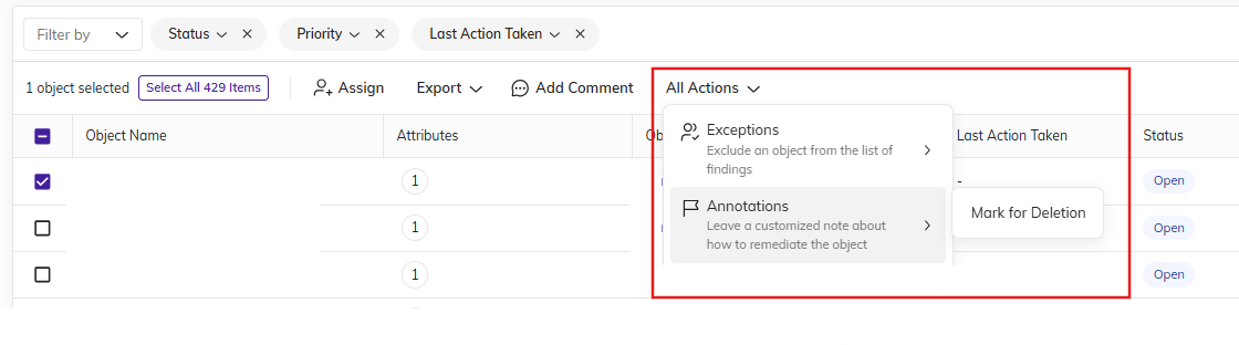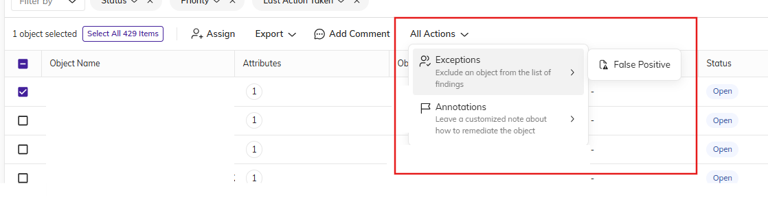Start by reviewing the assigned objects. This is done by clicking on the object name, which opens a detailed view of the flagged item, including the details associated with it, like object type, full file name, scanned date, and more. The upper right corner of this view also includes an Actions button, which contains the same user options as the "All Actions" button on the dashboard highlighted above. (Additional details about the actions are below.)